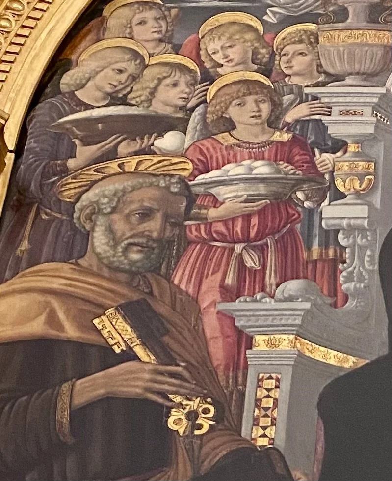 Matteo di Giovanni’s altarpiece (1477) shows the Virgin and Child enthroned, surrounded by saints (including Peter and Catherine of Siena) and angels (who hold snowballs!). In the predella you can see episodes from the miracle, including the outline of the basilica in the snow.